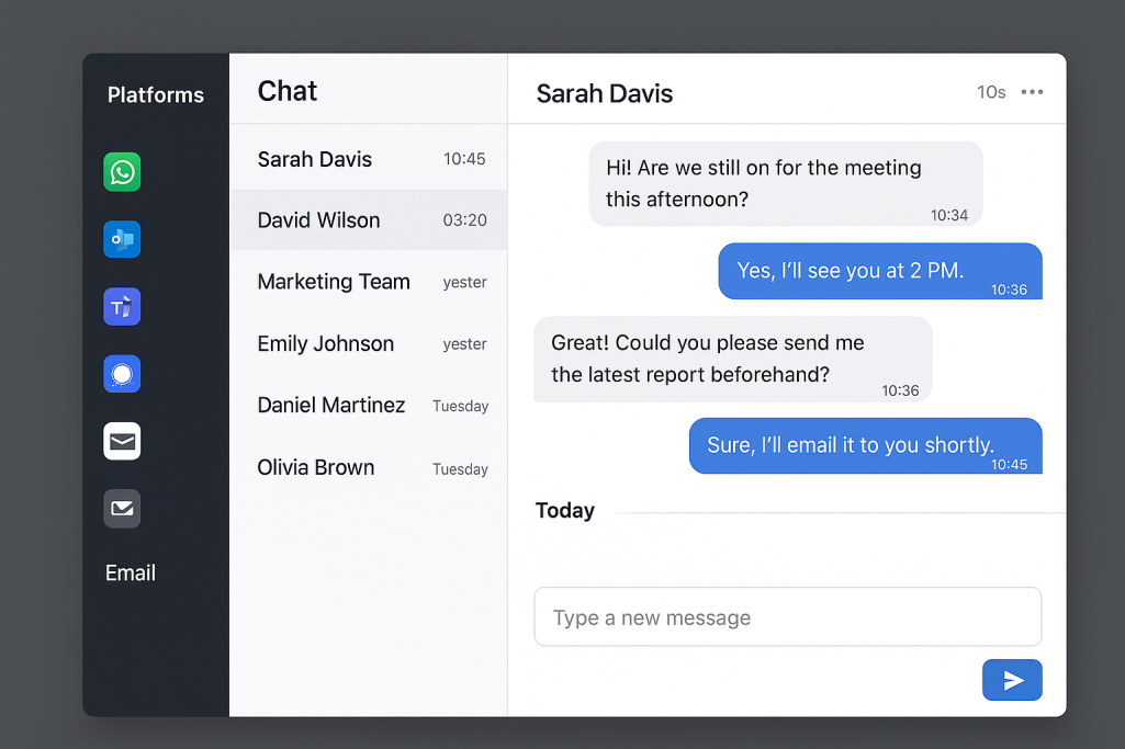 Syntana.ai ist eine KI-gestützte Plattform, die alle relevanten Kommunikationskanäle wie WhatsApp, E-Mail, Teams, Discord, Signal und mehr zentralisiert.